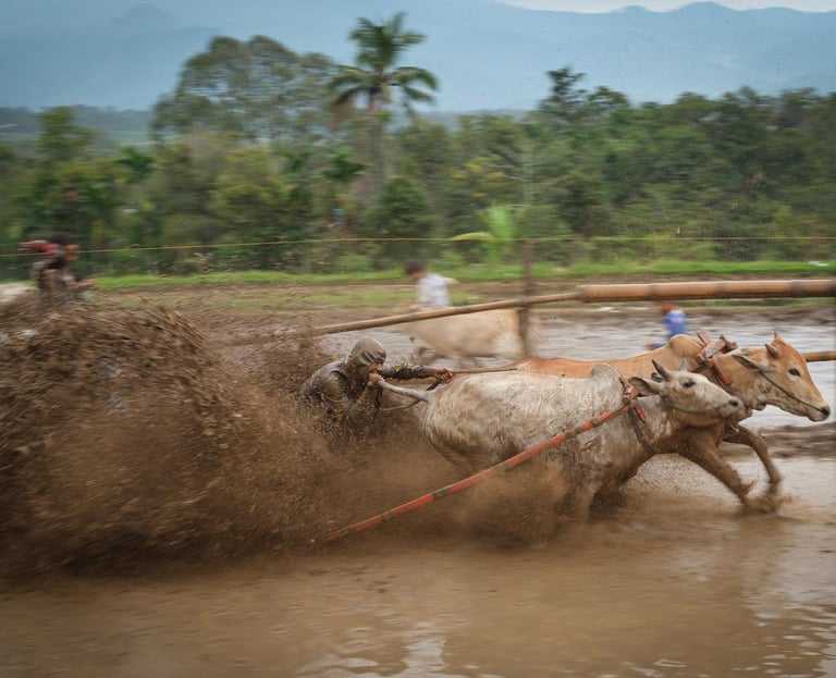 Embark on an exclusive journey through the heart of Sumatra, designed for photography enthusiasts and cultural explorers seeking an authentic experience. This trip offers an immersive encounter with the region’s rich traditions, stunning landscapes, and vibrant local life. One of the most thrilling highlights of this journey is witnessing the legendary "Pacu Jawi" (Bull Race) – an extreme and exhilarating spectacle found only in Sumatra. Held in muddy rice paddies, this centuries-old tradition is both a test of strength and a grand celebration of the rice harvest season. It offers a rare opportunity to capture dramatic action shots and to experience an authentic cultural festival deeply rooted in the local way of life.